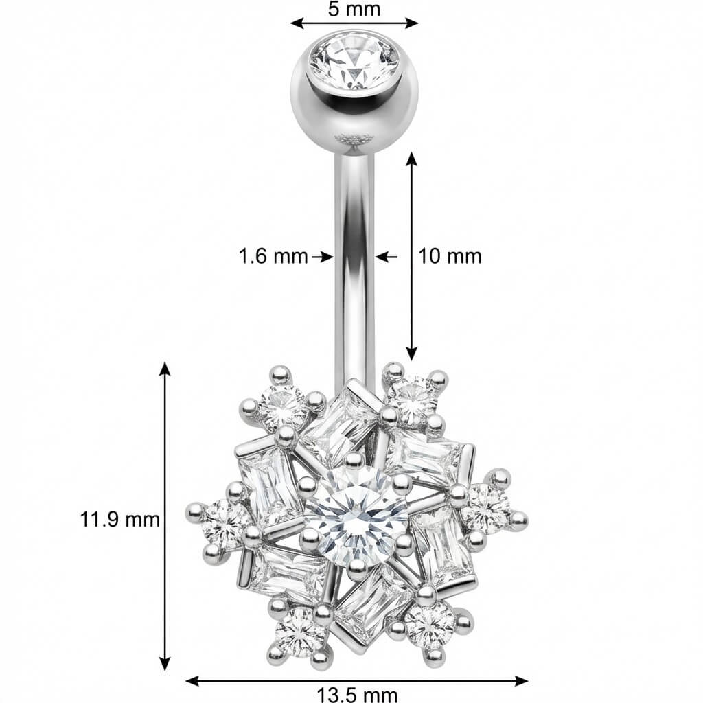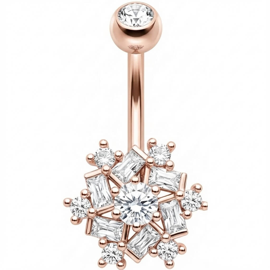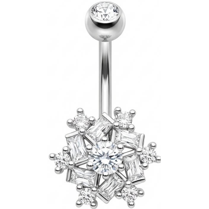Bring deinen Bauchnabel zum Strahlen! Dieses atemberaubende Schmuckstück ist dein perfektes Accessoire für den Sommer. Das funkelnde Schneeflocken-Design mit einem Mix aus Baguette- und runden Kristallen zieht alle Blicke auf sich. Gefertigt aus hochwertigem 316L Chirurgenstahl, ist es nicht nur super sexy, sondern auch angenehm zu tragen. Egal ob Strand oder Party – mit diesem Eye-Catcher setzt du ein glänzendes Statement. Hol dir den Glow für deinen Nabel!