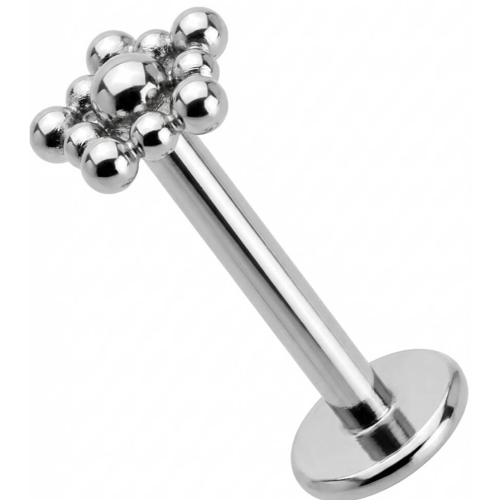 Verleihe deinem Look ein Upgrade mit diesem stylischen Kugel-Cluster. Das geometrische Design mit einer zentralen Kugel und feinen Perlen drumherum bildet eine elegante Rautenform. Gefertigt aus hochwertigem Titan, ist es super hautverträglich und langlebig. Das ideale Highlight für dein Helix, Tragus oder Lobe!