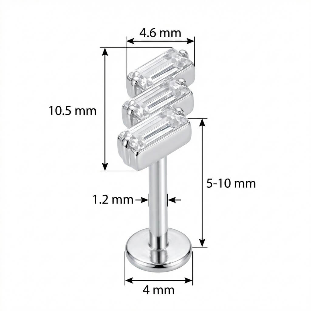 Bring dein Ear-Game auf das nächste Level! Dieses Design besticht durch drei klare Kristalle im Baguette-Schliff, die in einer coolen, diagonalen Stufenform angeordnet sind. Gefertigt aus hochwertigem Titan, ist das Schmuckstück nicht nur ein optisches Highlight, sondern auch super hautverträglich und langlebig. Der perfekte Hingucker für dein Helix oder Lobe.