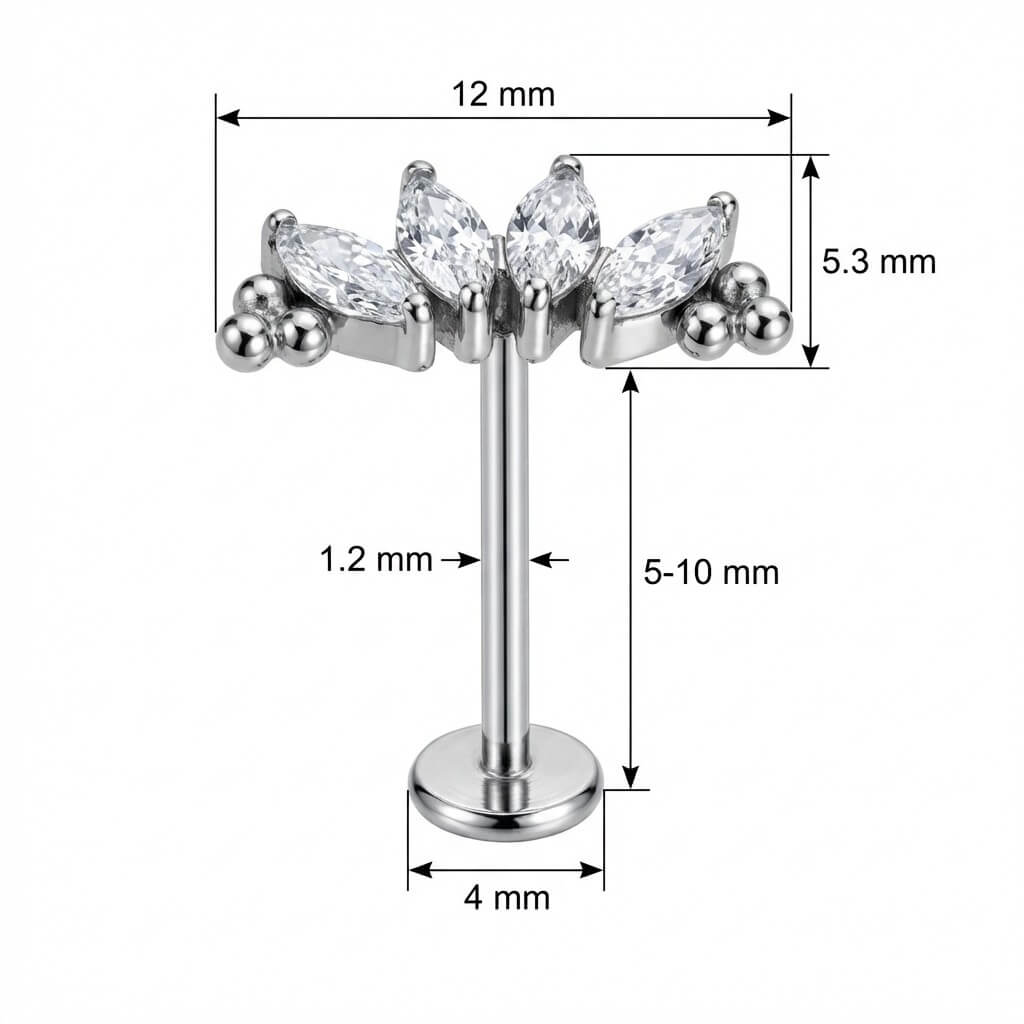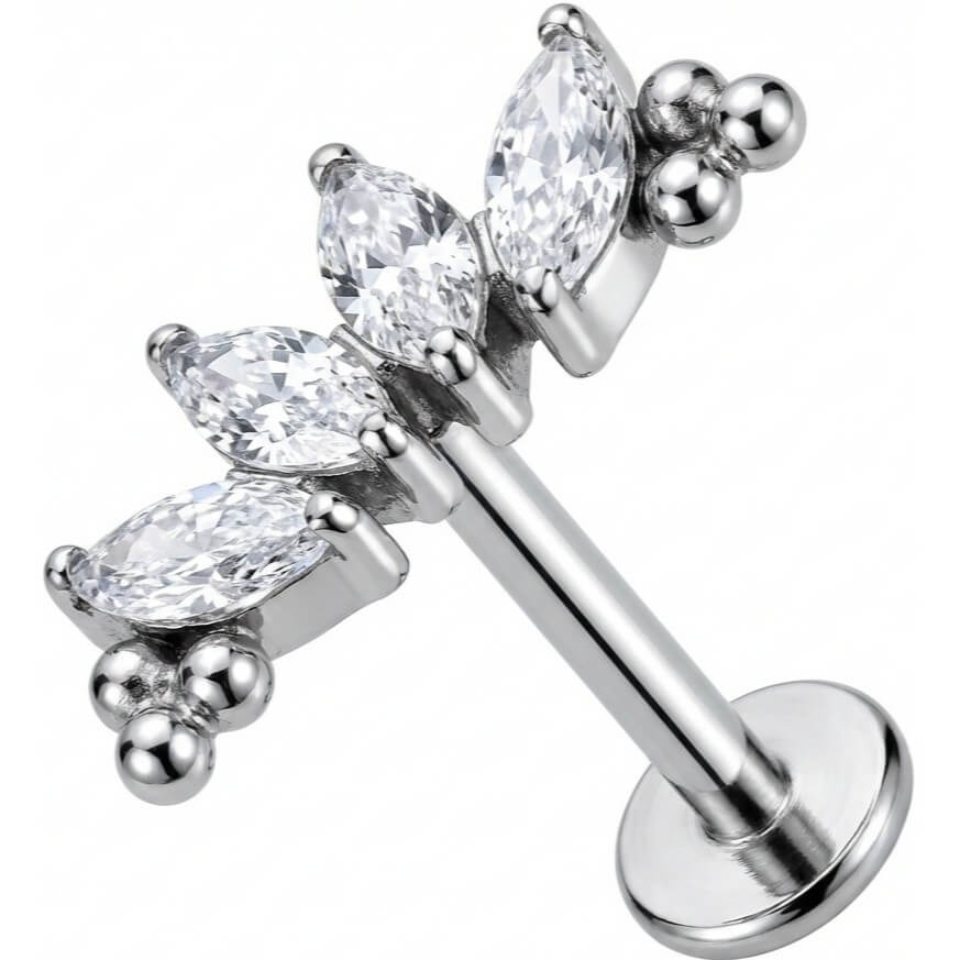 Bereit für das gewisse Etwas? Dieses wunderschöne Design besticht durch einen geschwungenen Bogen aus vier funkelnden Marquise-Steinen, eingerahmt von feinen Kugel-Clustern. Die Form schmiegt sich perfekt an die natürliche Kurve deines Ohres an. Gefertigt aus hochwertigem Titan, ist das Schmuckstück super hautverträglich und langlebig. Das ideale Upgrade für dein Helix, Conch oder Lobe.