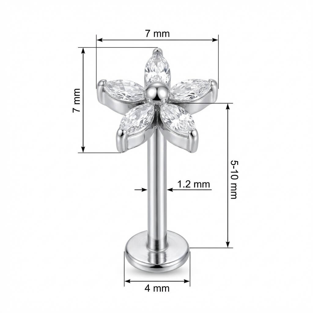 Lass deinen Style aufblühen! Dieses wunderschöne Design besticht durch sechs funkelnde Kristalle im Marquise-Schliff, die eine perfekte Blüte bilden. Gefertigt aus hochwertigem Titan, ist es nicht nur ein echter Hingucker, sondern auch besonders hautverträglich und langlebig. Das ideale Upgrade für dein Ear-Game – egal ob im Helix, Tragus oder Lobe. Hol dir den ultimativen Glow für jeden Tag!