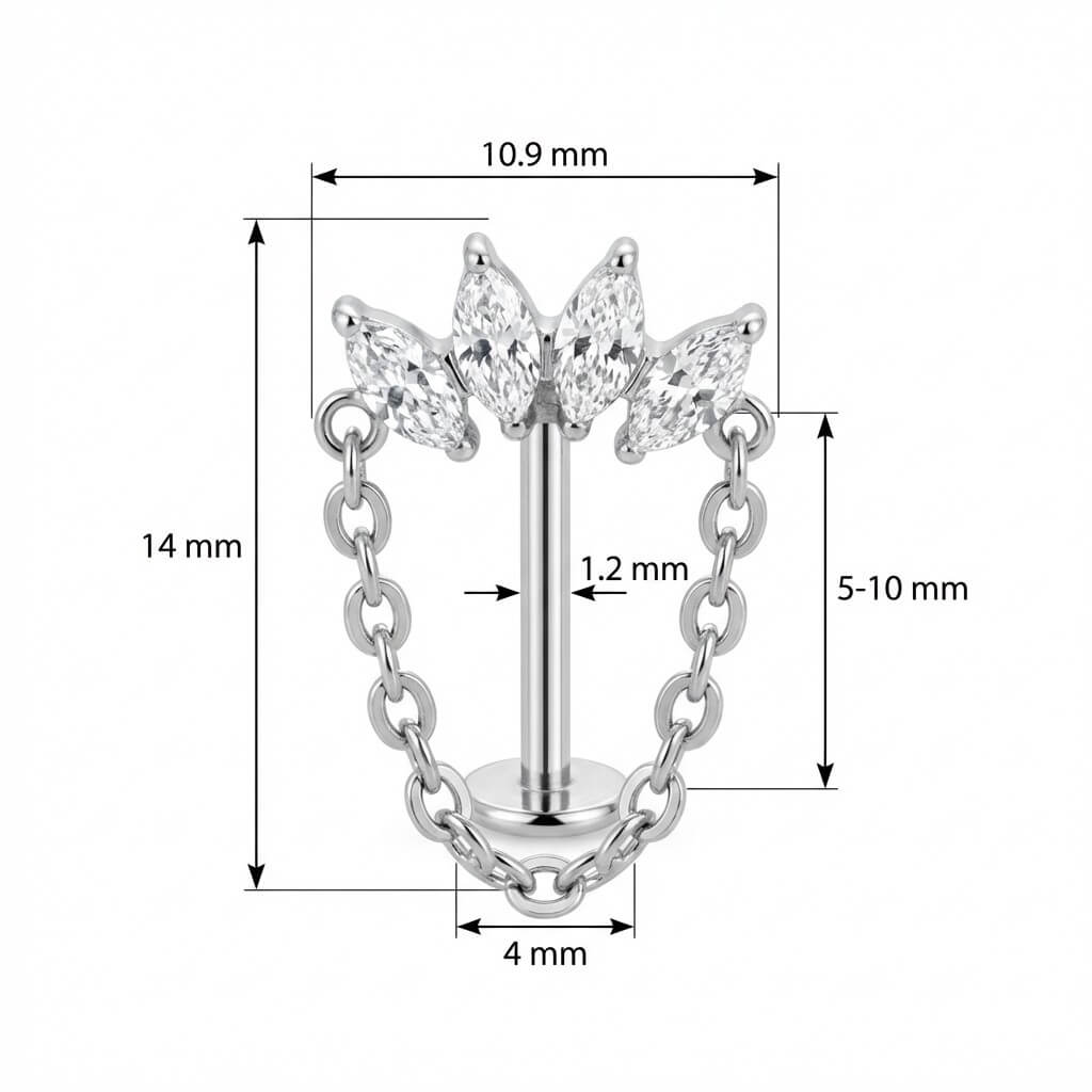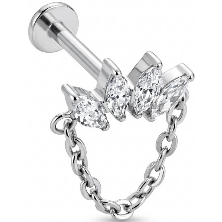 Verleihe deinem Look das gewisse Etwas mit diesem Highlight. Vier funkelnde Kristalle im Marquise-Schliff bilden einen eleganten Bogen, der durch eine zarte, hängende Kette perfekt ergänzt wird. Gefertigt aus hochwertigem Titan, ist das Schmuckstück super hautverträglich und langlebig. Perfekt, um dein Ear-Curation-Game auf das nächste Level zu heben – egal ob im Helix oder Lobe.