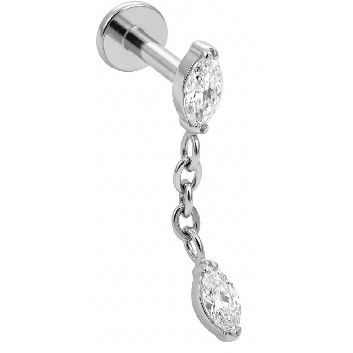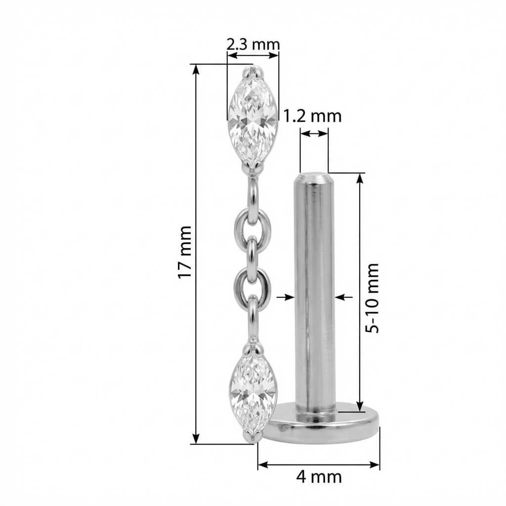 Bring ordentlich Bewegung in deine Ear-Party! Dieses Design besticht durch zwei funkelnde Kristalle im Marquise-Schliff, die durch ein zartes, hängendes Kettchen verbunden sind. Gefertigt aus hochwertigem Titan, ist das Schmuckstück super verträglich und langlebig. Der perfekte Hingucker, um dein Helix oder Lobe neu in Szene zu setzen.